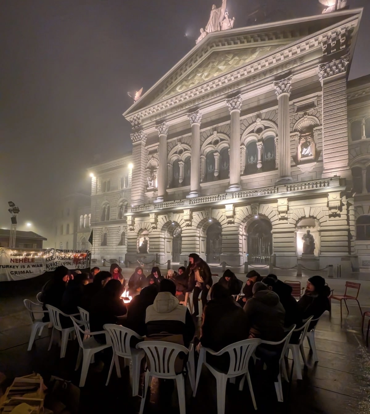 Gece saatlerinde hava sıcaklığının sıfırın altına düşmesine rağmen eylemciler battaniyelerle alanda kalmayı sürdürüyor. İsviçre polisi, ısınma amacıyla ateş yakılmasına izin vermezken, eylemciler Rojava’ya yönelik saldırılar sona erene kadar alandan ayrılmayacaklarını ifade ediyor.